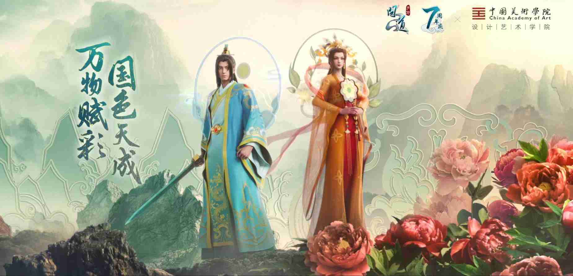 2023年4月,,《问道手游》联动中国美术学院,,在游戏中融合了中国历史上不同时期的文化元素,,打造了“山河万象”与“凤鸣九霄”的国风时装。。。。在色彩配置方面,,,,创作团队基于对游戏角色特性的分析提取相应的文化内涵,,,,从每一种色彩的色相、、指代事物和情感出发对应角色属性,,,选定服装的色彩搭配。。。在纹样设计方面,,,,创作团队结合游戏角色自身特殊的造型比例和形态,,在实际的纹样设计中进行了游戏语境下的活化演绎。。。。男性角色集中使用了如蟒纹、、、、海水江崖纹、、、如意纹和云气纹等传统纹样元素,,,女性角色则吸纳了凤凰纹、、牡丹纹、、卷草缠枝纹等元素,,,,组成以“双凤牡丹纹样”“缠枝牡丹纹”“金玉凤冠头饰”为主要纹样的游戏角色装饰图案系统。。。