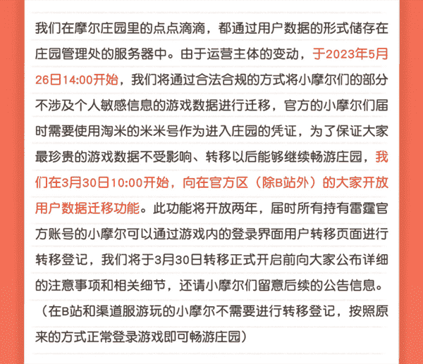 合作结束本就是开发方和代理方双方的事情,,,降低这件事情对玩家的影响,,,,才是对所有珍视这段童年的摩尔玩家最好的呵护。。。。目前看来,,用户完全不用担心后续因无法登录游戏而造成任何数据上的损失,,,,只要及时进行账号转移,,,,就可以好好保留、、、延续在庄园的痕迹和回忆,,,继续在庄园里做快乐的红鼻子小鼹鼠。。。