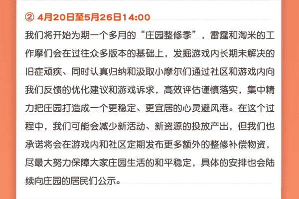 合作的结束并不意味着这个童年IP的结束,,,对于《摩尔庄园》手游而言,,这是一个新阶段的开始。。后续游戏内将开启庄园重构计划,,,会就以往遗留下来的BUG进行集中修复,,并在游戏内和社区定期发布更多补偿物资。。。。